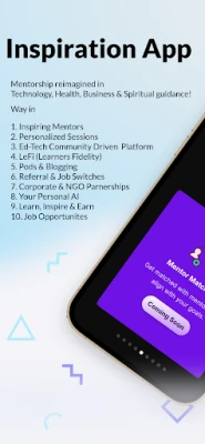 يُقدر Inspiration App شغفك بالتعلم من خلال برنامج 'تعلم واكسب' الذي يكافئ المتعلمين النشطين ويوفر لهم فرصًا للارتقاء. افتح أبوابًا لمستقبل مشرق مع فرص وظيفية متميزة للشركات الناشئة، بما في ذلك التدريب العملي والمشاريع الحية والوصول إلى مركز Inspiration App لدعم الشركات الناشئة للحصول على التمويل والإرشاد والتسريع. كما يتيح لك التطبيق إمكانية التعاون مع عمالقة الصناعة والمنظمات غير الحكومية عبر برامج وشراكات منسقة. إن Inspiration App ليس مجرد تطبيق؛ بل هو حركة لجعل الإرشاد متاحًا وهادفًا وممكّنًا للجميع. ثق في مسيرتك التعليمية مع Curious Business Solutions، المنظمة المعتمدة من MCA وMSME، لضمان أعلى مستويات المصداقية والأمان.